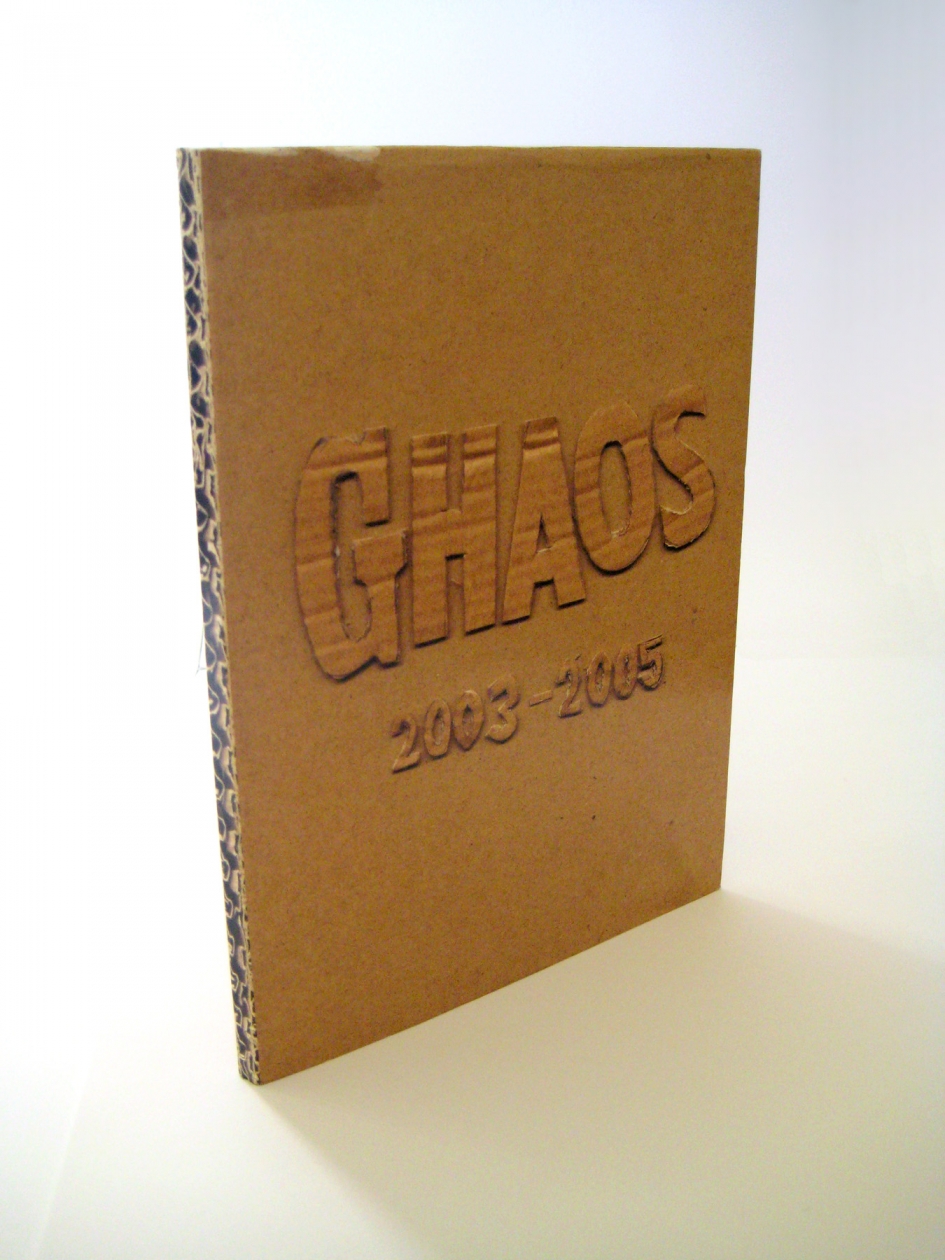 The design concept takes one of the elements that bound the various events together: corrugated cardboard. The cover can be seen as the cardboard tombstone to GHAOS, adorned with cut out letters. Rip it open and inside the cardboard shows its guts, containing the ‘cardboard’ disc and a hand written contents list. The spine binds the package together as a single slab of cardboard.